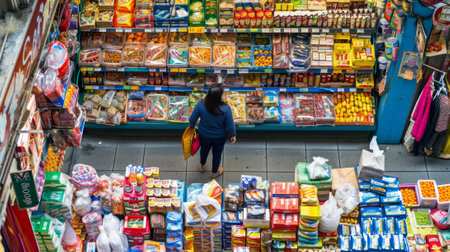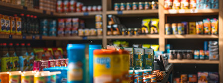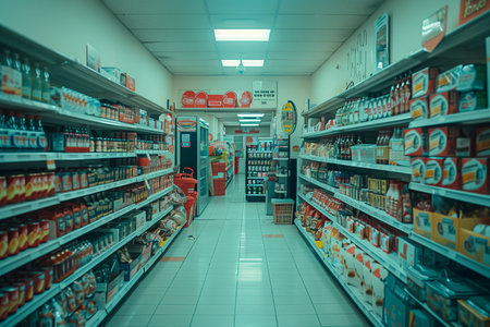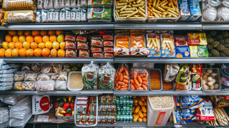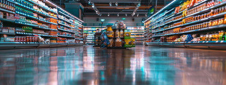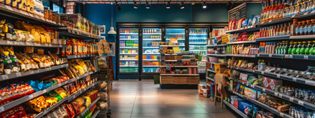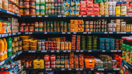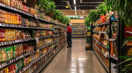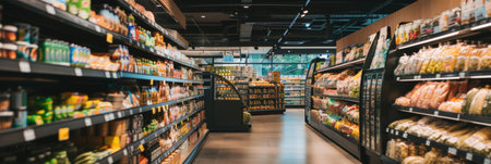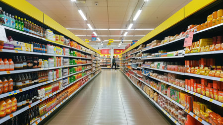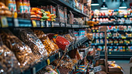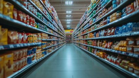 An interior shot depicts a supermarket aisle filled with shelves displaying a diverse selection of packaged food items. The scene features bright overhead lighting highlighting the colorful array of products. This image could be used for commercial projects related to retail, consumerism, or food industry themes. The composition suggests an organized and well-stocked environment.