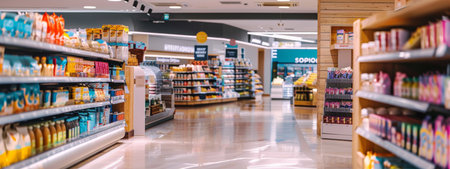 A clean and modern grocery store aisle featuring neatly organized products on shelves. The spacious, well-lit environment captures the essence of contemporary retail shopping, making it ideal for themes related to consumerism, grocery shopping, and retail environments.