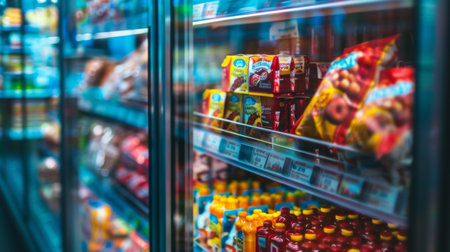 A brightly lit supermarket freezer section displaying an assortment of packaged goods, creating a colorful and modern retail scene.