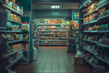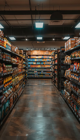 An empty aisle inside a grocery store showcases organized shelves filled with a variety of products, accentuated by dim lighting for an intriguing ambiance.
