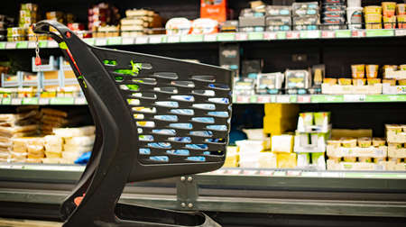 Panoramic view of a department in a supermarket. Various products on the shelves of a supermarket. Grocery store.