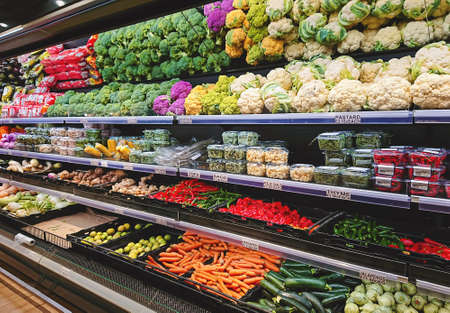 Fruits and vegetables on the shelves of a grocery store or supermarket