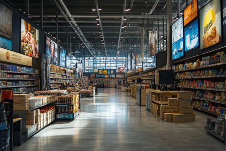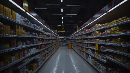 Long supermarket aisle with an array of products, showcasing the diversity and abundance of goods available.
