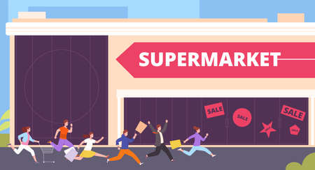 Shoppers run to supermarket. Crowd running rush shop or electric store, panic shopper push cart customer hurry buy good offer big sale happy shopping