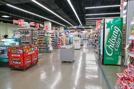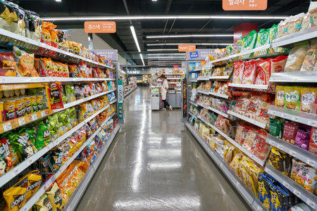 BUSAN, SOUTH KOREA - MAY 25, 2017: inside a Lotte Mart in Busan. Lotte Mart is an east Asian hypermarket that sells a variety of groceries, clothing, toys, electronics, and other goods.