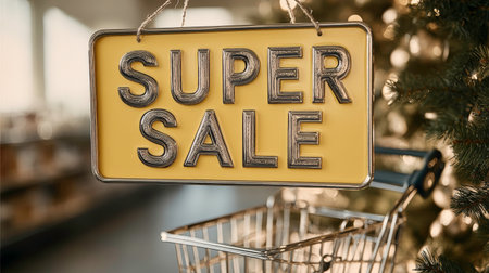 A rectangular yellow sign with a metallic border and textured silver lettering that reads SUPER SALE is suspended by a thin string. Below the sign, a blurred silver shopping cart is partially visible, and the out-of-focus background suggests a festive atmosphere with twinkling lights and possibly a Christmas tree. The image implies holiday shopping discounts.