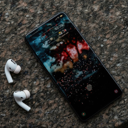 A modern smartphone and a pair of wireless earbuds are positioned on a textured surface. The phone's screen displays a colorful abstract image. The composition features overhead lighting and a high-angle perspective, emphasizing the tech devices. It could be used for various technology-related advertising or editorial applications.