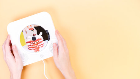 Top view of hands holding a heart-shaped object next to a compact disc player on a yellow background. This image symbolizes love for music and makes a great gift idea.
