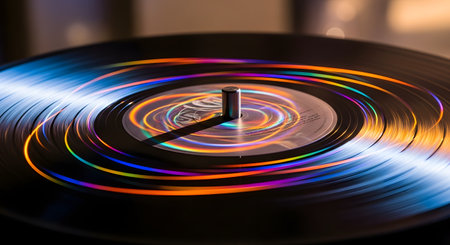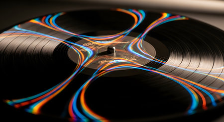 A close-up of a black vinyl LP record with mesmerizing, colorful light trails reflected on its grooved surface. The swirling patterns of blue, orange, and red create a vibrant and psychedelic effect. The image blends retro music culture with modern, abstract art.