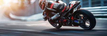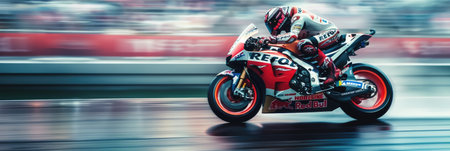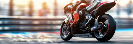 A skilled motorcycle racer, attired in red racing gear, expertly navigates a curve on a race track. The asphalt glistens under bright sunlight while the motorbike zips along, embodying speed and adrenaline.