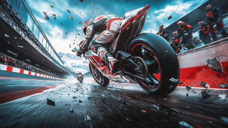 A dramatic side view capturing a motorcycle accident during a thrilling race, showcasing the explosion and vibrant energy in the moment.