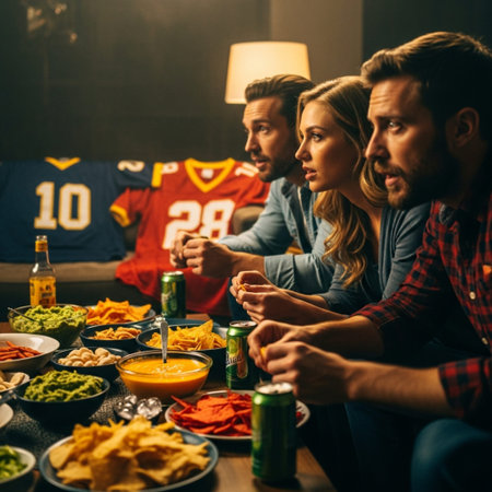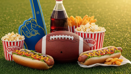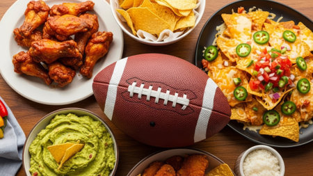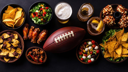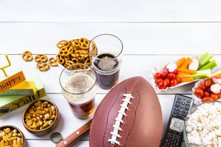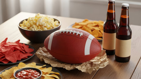 There is a table full of delicious snacks and beverages prepared for watching American football. Generative AI.