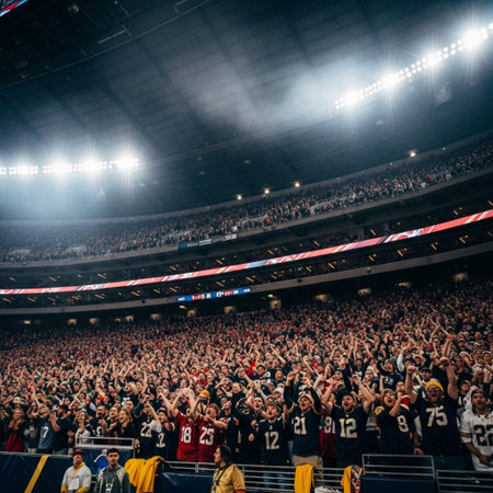 Vibrant American football stadium packed with enthusiastic fans at sunset, capturing the excitement and energy of a live game. Perfect depiction of sports culture and community spirit.