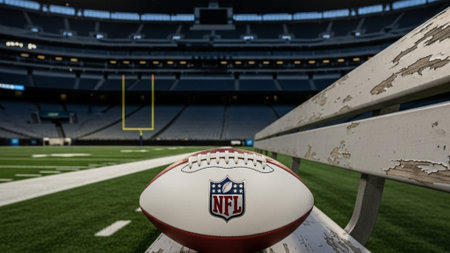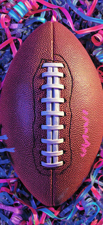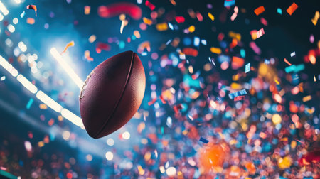 A football flies through the air as colorful confetti rains down, softly lit by stadium lights, marking a moment of triumph and celebration.