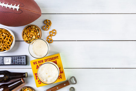 Chips, salty snacks, football and Beer on a table. Great for Bowl Game projects.