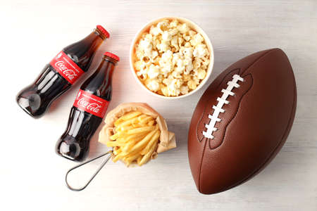 Odessa, Ukraine - November 16, 2021: Concept of Super bowl snacks on white wooden background