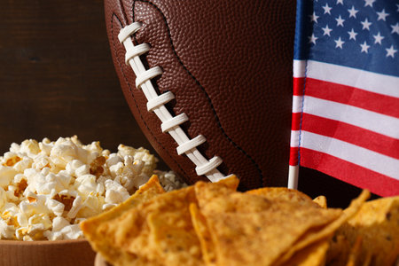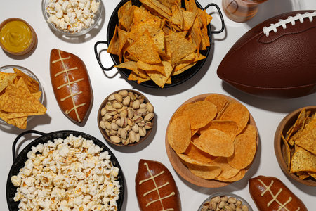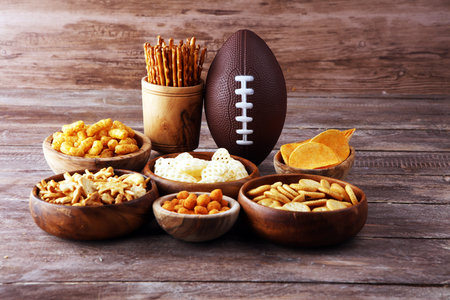Chips, salty snacks, football on a table. Great for Bowl Game projects.