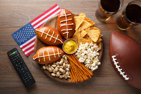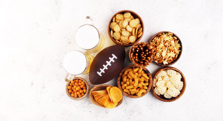 Snacks for watching an American football game. Beer, chips, pretzels, sauce on wooden background. Top view