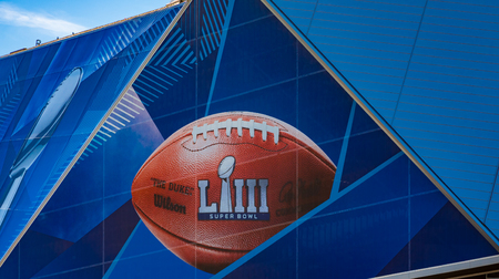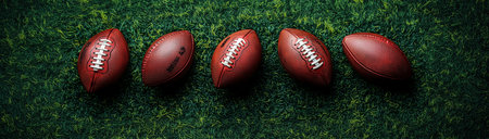 NEW YORK, USA - MAY 28, 2018: Rows of american football balls in NFL Experience in Times Square, New York, a first-of-its-kind live action attraction, combining interactive games and 4D theatre.