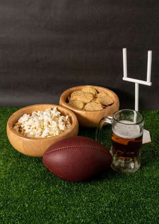 American football party. American football ball, beer, snacks and goal post on green grass and black background