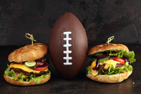 Tasty fresh meat burgers with salad and cheese. Homemade angus burger. Great for Bowl football Game