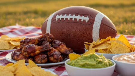 Football party snacks: wings, chips, guac, dip on checkered blanket