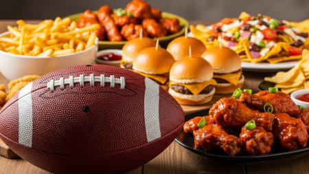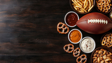This image features a vibrant arrangement of game day snacks, including fries and pretzels, along with a football. Perfect for sports celebrations.