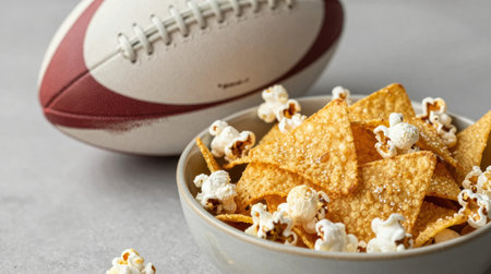 A football sits next to a bowl filled with popcorn and tortilla chips during a World Cancer Day event.