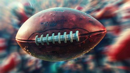 An American football caught in flight, moments before a touchdown, with the stadium crowd in a thrilling blur, highlighting the anticipation and excitement of American football.