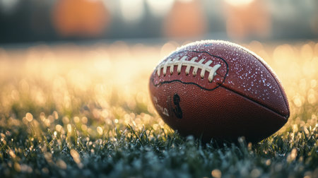Football covered in dew resting on frosty grass during a beautiful sunrise, creating a serene and inspiring sports background