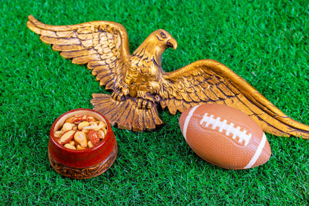 An eagle statue is placed bowl of mixed nuts American football on green grass for super bowl sports gathering.