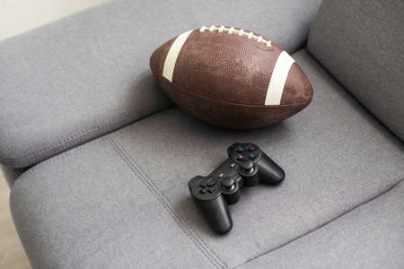 American football ball with natural lighting on dark background. Horizontal sport theme poster, greeting cards, headers, website and app