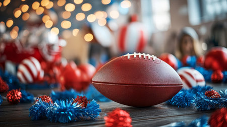 Brown football on wooden table, surrounded by red and blue decorations with warm bokeh background.