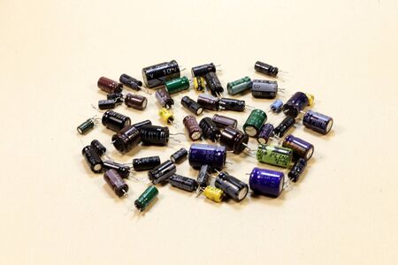 Electrolytic or electrolyte capacitors heap on white background, electronic parts concept.
