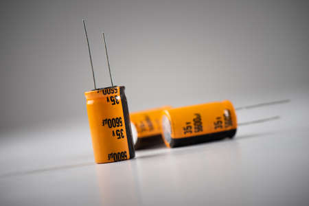 Electrolytic capacitors on a white background. Electronic elements for electronic devices.