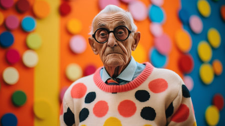 Happy elderly man portrait with balloons as background. Generative AI