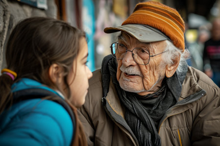 Elderly man talking to his granddaughter at the street market.