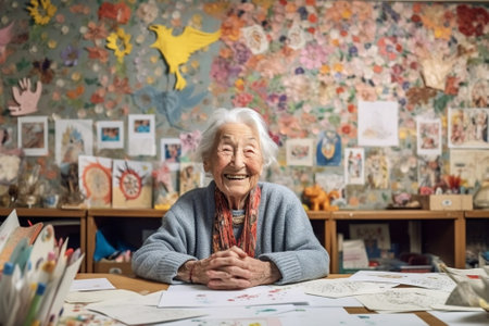 Generative AI : Happy senior female in stylish outfit smiling and examining papers with colorful palettes while working on design project in creative workplace
