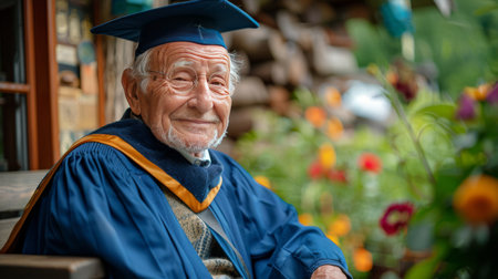 An older man in a graduation gown sitting in front of a vibrant array of flowers, reflecting a significant achievement and celebration.