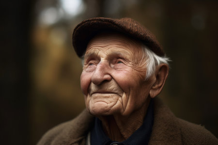 Portrait of an elderly man in a hat on a background of nature