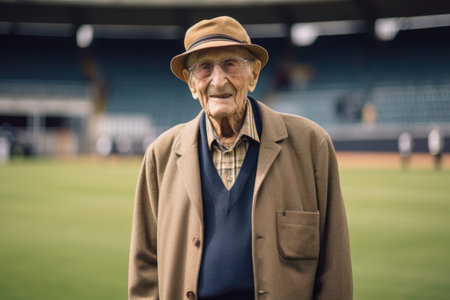 Portrait of senior man wearing hat and coat standing in baseball stadium