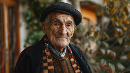 Portrait of an elderly man in a jacket and headscarf