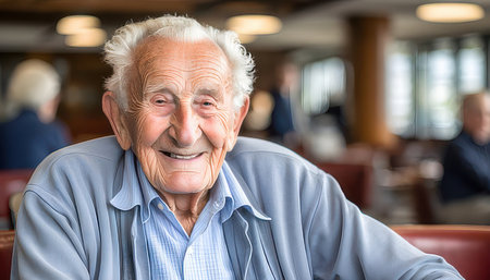Elderly man smiling for camera in cozy home setting, portraying happiness and contentment