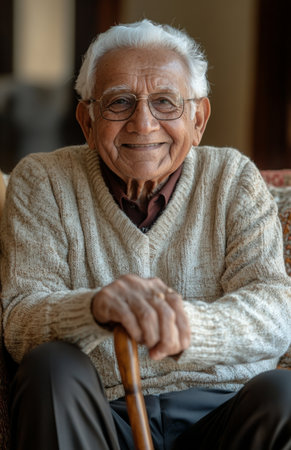 An elderly Indian man relaxes on a sofa, smiling warmly while resting on a cane