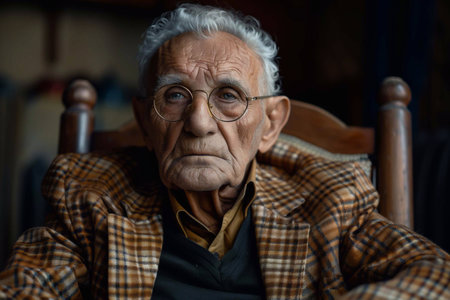 An elderly man in glasses relaxes in a wooden chair, dressed in a sports suit