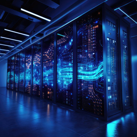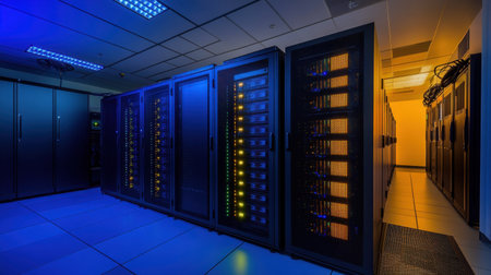 Advanced data center with rows of servers, bathed in dynamic blue and yellow light, symbolizing technological progress