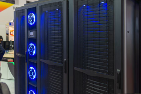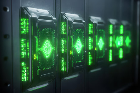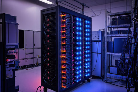 close-up of a server rack with glowing led lights, created with generative ai
