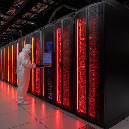 Person in a protective suit is standing in a large server room, working near server racks that have glowing red lights highlighting the network cabling and components within. The room's interior is dark and the floor is tiled.