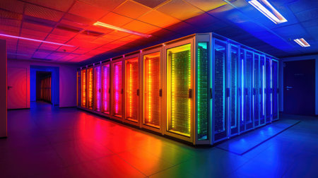 This image features a vibrant server room illuminated by colorful RGB lighting. The sleek cabinets and modern technology create a high-tech atmosphere ideal for data storage solutions.