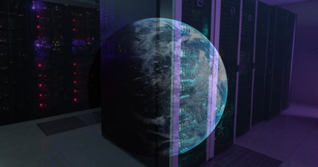 Image of a globe against computer server room. Global networking and business data storage technology concept